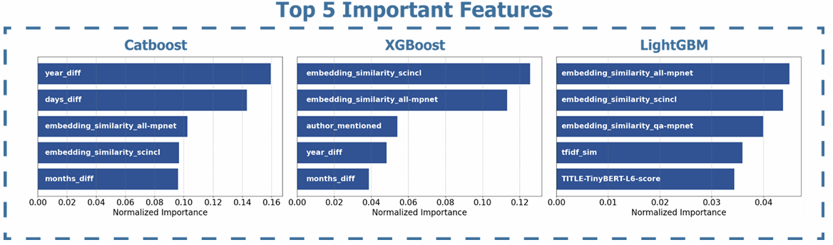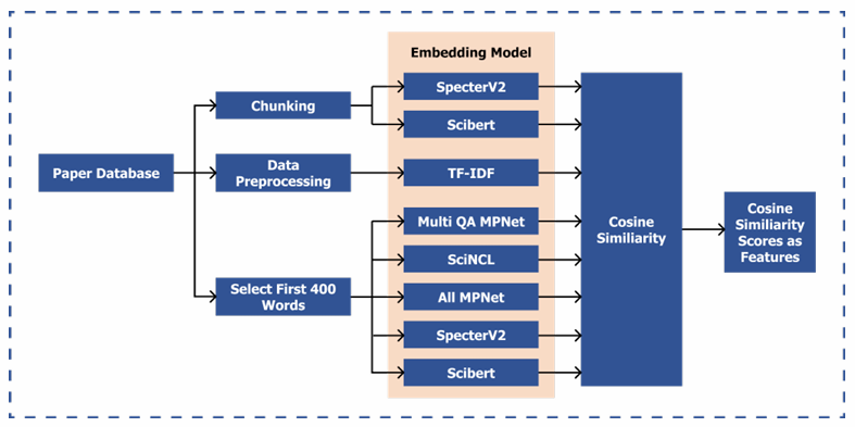 - Text-Derived Features: Leveraged transformer embeddings from models like SPECTER2, SciBERT, SciNCL, Multi-QA-MPNet, and All-MPNet. Cosine similarity was calculated on embeddings. Additional features included regex-based author mentions, BM25 retrieval scores, and TF-IDF title similarity.