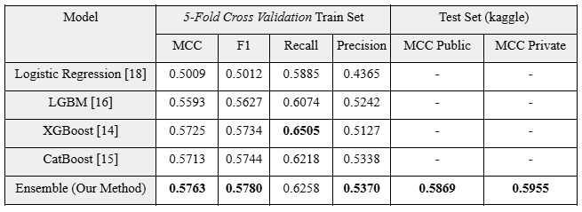 I started with Logistic Regression as a baseline, then explored Gradient Boosted Tree models: LightGBM, XGBoost, and CatBoost. Using 5-fold cross-validation, I tuned thresholds based on MCC to handle imbalance. The final model was an ensemble of the three GBT models via soft voting, which improved robustness and metrics.